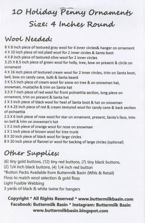 From Buttermilk Basin By West, Stacy In Wool This is a great pattern with endless ideas and features 10 different Holiday motifs! You can make any of these ornaments to trim the tree, a gift tag or even turn them into a pin cushion! Each ornament measures 4 inches round in size.