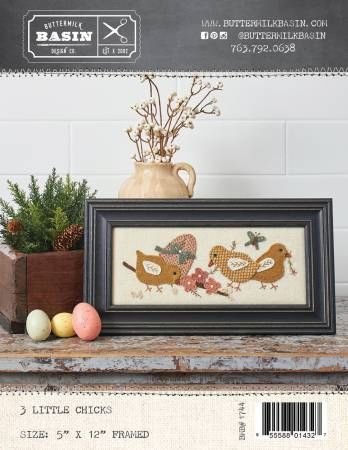 3 Little Chicks is the perfect framed project to display this spring! The wool applique project is 4 1/2in x 11 1/2in inside the frame.