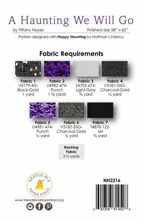 From Needle In A Hayes Stack By Hayes, Tiffany In Quilts Step right up if you dare with this spooky and fun quilt! Quilt design featuring Happy Haunting by Hoffman Fabrics. Quilt finishes at 58" x62". Printed Paper Pattern Finished Size: 58in x 62in Final Product: Quilt Technique Used: Standard Machine Sewing Skill Level: Confident Beginner