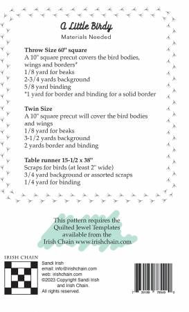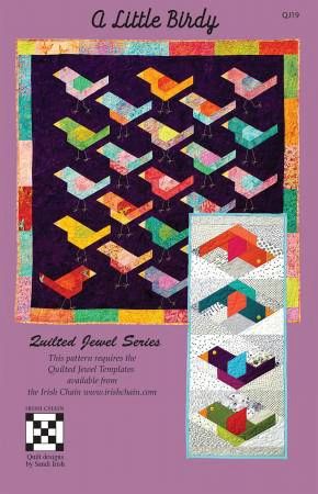 From Irish Chain By Irish, Sandi In Quilts Make brightly colored birds or choose from a robin, cardinal, bluebird, oriole, goldfinch or even a crow! This pattern works great with a 10" pre-cut. A Little Birdy is part of the Quilted Jewel Series and requires the Quilted Jewel Templates (also from the Irish Chain). Three sizes are available: Throw-60" square, Twin-63 x93" and table runner-15-1/2 x 38" Printed Paper Pattern Finished Size: 60in x 60in Final Product: Quilt Technique Used: Standard Machine Sewing Skill Level: Confident Beginner