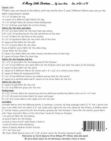 From Fiberworks Inc By Heine, Laura In Quilts A Merry Little Christmas Collage Pattern by Laura Heine. Just in time for Christmas, this quilt not only represents the spirit of giving, compassion, a place where you can dream of peace and remembrance. If gives you warmth and love because there's no place like home. This pattern includes color photos, full size drawing and step by step instructions to complete this quilt. Printed Paper Pattern Finished Size: 34in x 31in Final Product: Wall Hanging Paper Templates Included Technique Used: Standard Machine Sewing Skill Level: Confident Beginner