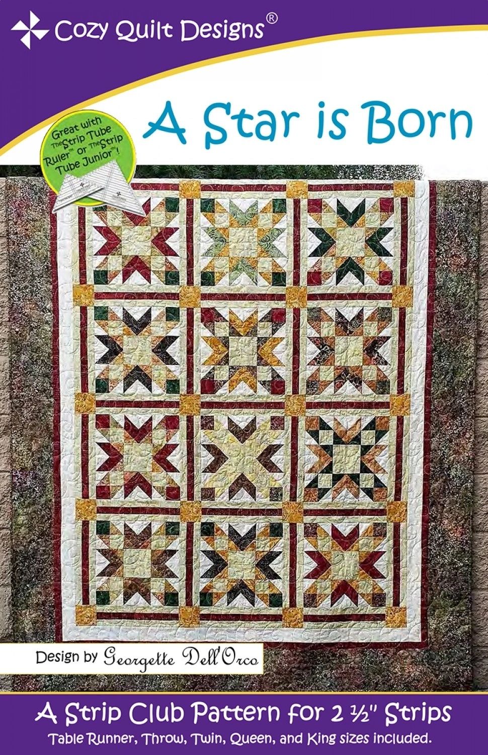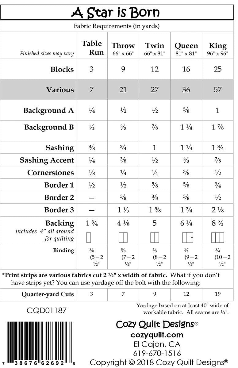 From Cozy Quilt Designs By Stout, Daniela In Quilts A Star is Born is From March's Strip Club of 2018. A Strip Club Pattern Designed for 2-1/2in Strips! This quilt has a finishing block of a 12in square using 6 different fabrics. Finish Size for the cover sample is 66in x 66in. Pattern includes instructions for sizes: Table Runner, Throw, Twin, Queen and King.