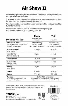 An updated version of our popular Air Show quilt pattern, Air Show 2.0 features larger blocks and an easier layout which is perfect for quick quilt making! Foundation paper piecing makes these quilts easy enough for beginners, but fun for experienced quilters as well. The pattern includes full-sized foundation patterns plus step-by-step instructions for paper piecing and assembling quilts in two sizes: A man-sized 60" x 71" throw, A 79" x 94" twin comforter Techniques used include foundation paper piecing, machine piecing, and quilting by hand or machine.