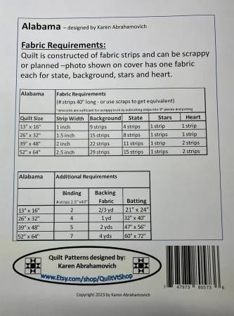 From Karen Abrahamovich By Abrahamovich, Karen In Quilts Alabama- A quilt Pattern in 4 Sizes! Alabama is the leading producer of cotton and known as the Heart of Dixie and for its Southern Hospitality The finished quilt size is determined by the width of the strips used for construction. Strip widths range from 1" to 2.5" and a detailed construction "map" guides provides details needed to produce a great quilt! Quilt size options are 13" x 16", 26" x 32", 39" x 48", 52" x 64". Sizes vary for multiple wall hanging options (the smallest also is a great size for a pillow) or go big for a great throw quilt.