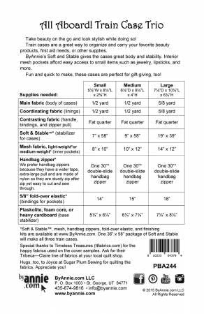 From ByAnnie By Unrein, Annie In Bags, Purses, Totes & Electronic Covers Take beauty on the go and look stylish while doing so! Whether you're globetrotting or touring closer to home, you'll love these stylish cases for carrying cosmetics, jewelry, first aid supplies, and more. Use the larger case for extended vacations and the smaller cases for a quick weekend getaway. Throw in your glam and you're ready to go anywhere! Uses Annie's Handbag zippers (PBAZIP30-color)
