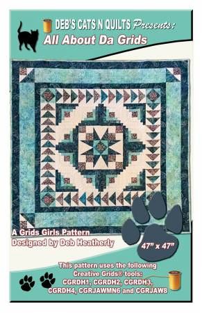 From Deb's Cats N Quilts By Heatherly, Deb In Quilts All About Da Grids is a Grids Girls pattern that uses the following Creative Grids Tools: CGRDH1 Cat's Cradle Tool, CGRDH2 Strippy Stars Tool, CGRDH3 Turbo 4 Patch, CGRDH4 Ultimate Flying Geese Tool, CGRJAW8 8in Square on Square Tool, and CGRJAWMN6 6in Log Cabin Trim Tool. This pattern will be a hit with your Grids Girls and is a great tool to use in your Creative Grids Shop Program. The quilt finishes 47in x 47in.