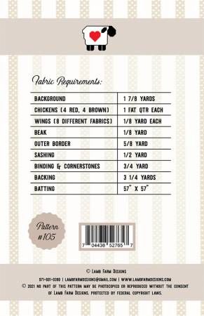 From Lamb Farm Designs By Lamb, Jennie Jo WRAPUPSALE_2024 Collection In Quilts 49" x 49" wall hanging or table topper. Machine pieced chubby chickens set with sashing and cornerstones and a cute pinwheel border to set these chickens off. Fat quarter or fat eighth friendly quilt. Great for a confident beginner. Directions step by step with great graphics and all pressing directions included. Printed Paper Pattern Finished Size: 49in x 49in Final Product: Quilt Technique Used; Standard Machine Sewing Skill Level: Confident Beginner