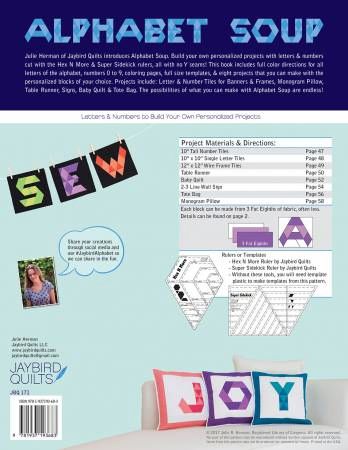 From Jaybird Quilts By Herman, Julie In Quilting - General Julie Herman of Jaybird Quilts introduces Alphabet Soup. Build your own personalized projects with letters & numbers cut with the Hex N More & Super Sidekick rulers, all with no Y seams! The book includes full color directions for all letters of the alphabet, numbers 0 to 9, coloring pages, full size templates and eight projects that you can make with the personalized blocks of your choice. Projects include: Letter & Number Tiles for Banners & Frames, Monogram Pillow, Table Runner, Signs, a Baby Quilt & a Tote Bag. The possibilities of what you can make with Alphabet Soup are endless! Pages: 65 Author: Julie Herman Publish Date: 2017 Softcover