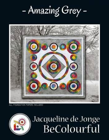 From Becolourful By Jacqueline De Jonge By Jonge, Jacqueline De In Quilts I guess it's no surprise how we got the name for "Amazing Grey". Not because of the fact that Jacqueline loves Greyhounds, -at this moment she lives with an adopted, twelve year old Greyhound Amy- but when Jacqueline was working on the design for this quilt she noticed that black as a background fabric didn’t really match the design and more white would be too much. So why not grey? That turned out to be a bull's-eye. The grey complemented the Rainbow colors beautifully and gave this design a very special look. And it's something completely different for a BeColourful quilt.