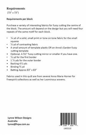 From Lynne Wilson Designs By Wilson, Lynne In Quilts Beautiful designs can be created for the center of each block by ‘fussy’ cutting your favorite fabrics for stunning effect. The quilt is machine pieced with no Y seams and suitable for beginner to more advanced sewists. Start collecting interesting fabrics such as the prints used in the cover quilt which are all from Anna Maria Horner collections. Quilt Measures 73in x 73in. Anna’s Garden makes good use of larger scale prints and instructs in the fussy cutting method. Methods for easy machine piecing are included. An optional acrylic template is available for fussy cutting the center squares.