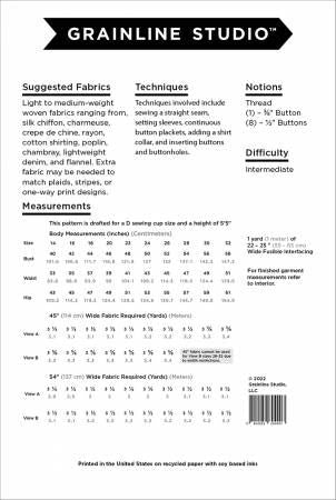 From Grainline Studio LLC By Beeman, Jennifer In Wearables The Archer Button Up is a loosely fitted button up shirt with slightly dropped shoulders and long sleeves. View A has a traditional box pleat at the back yoke and angled cuffs, while View B has a gathered lower back detail and straight cuffs. Techniques involved include sewing a straight seam, sewing darts, setting sleeves, creating continuous button plackets, adding a shirt collar, and inserting buttons & buttonholes. Printed Paper Pattern Finished Size: 14-32 Final Product: Wearables/ Clothing Paper Templates Included Technique Used: Standard Machine Sewing Skill Level: Intermeidate