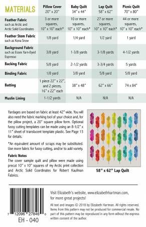From Elizabeth Hartman By Hartman, Elizabeth In Quilts Patchwork feathers quilt pattern featuring baby 70in x 80in picnic quilt, 58in x 62in lap quilt, 34in x 44in baby quilt, and 20in x 20in pillow projects. Pattern can be made with 10in precut squares and includes guides for optional fussy cutting. All projects are made using conventional patchwork techniques. No fussy cutting!