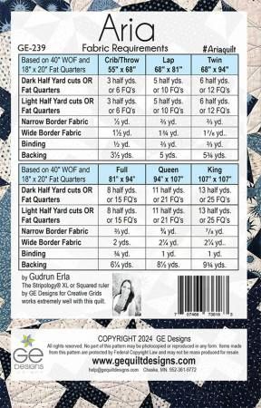 From G. E. Designs By Erla, Gudrun In Quilts The visually stunning Aria pattern creates a great illusion of curves with its geometric design. Even though it may look complicated, it is much easier to make than it looks using the Creative Grids Stripology Squared or the Creative Grids Stripology XL ruler by GE Designs. Instructions for using regular rulers are included. The quilt looks great as a 2 color quilt or multi color, the options are endless. The pattern comes with 6 different size options: crib, lap, twin, full, queen, king. Printed Paper Pattern Finished Size: Multiple Final Product: Quilt Technique Used: Standard Machine Sewing Skill Level: Confident Beginner