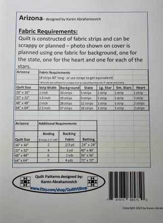 From Karen Abrahamovich By Abrahamovich, Karen In Quilts Arizona - A quilt Pattern in 4 Sizes! Arizona is one of the 4-Corners states known for its desert basin and range regions. The finished quilt size is determined by the width of the strips used for construction. Strip widths range from 1" to 2.5" and a detailed construction "map" guides provides details needed to produce a great quilt! Quilt size options are 16" x 16", 32" x 32", 48" x 48", 64" x 64". Sizes vary for multiple wall hanging options (the smallest also is a great size for a pillow) or go big for a great throw quilt.