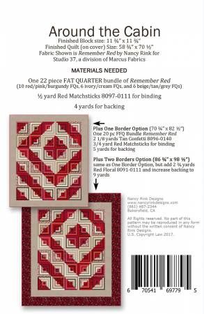From Nancy Rink Designs By Rink, Nancy In Quilts The classic log cabin block meets fat quarters in 3 sizes in Around the Cabin. Finished quilt: 58-3/4in x 70-1/2in Plus 1 border: 70-3/4in x 82-1/2in Plus 2 borders: 86-3/4in x 98-1/2in