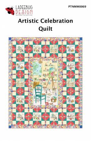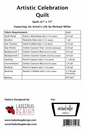 From Ladeebug Designs WRAPUPSALE_2024 Collection In Quilts Features Michael Miller's An Artist's Life collection. Finished size: 61" x 75". The block design in this quilt is based on a traditional sawtooth star block with some modifications. First, half-square-triangles are used instead of flying geese for easier piecing. Then, a small fabric strip is inserted between the 1/2-square-triangles to give a more modern feel.