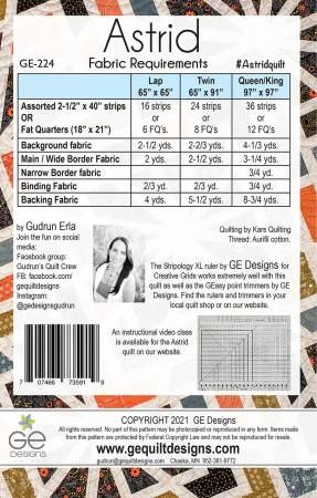 From G. E. Designs By Erla, Gudrun In Quilts The striking look of Astrid is much easier to create using the Stripology XL ruler with a focus fabric and some 2-1/2" strips or fat quarters. Instructions for using regular rulers are included. The pattern comes with 3 different size options: lap, twin, queen/king