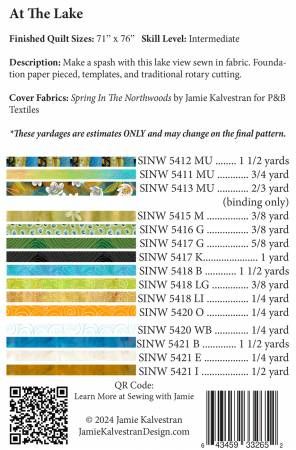 From Jamie Kalvestran Design LLC By Kalvestran, Jamie In Quilts Make a splash with this lake view sewn in fabric. Foundation paper pieced, templates, and traditional rotary cutting. Printed Paper Pattern Finished Size: 71in x 76in Final Product: Quilt Paper Templates Included Technique Used: Standard Machine Sewing / Foundation Paper Piecing Skill Level: Intermediate