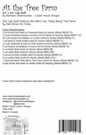 65" x 85" Christmas lap quilt showing life at the tree farm. Uses the black panel from Holly Berry Tree Farm by Deb Strain. Printed Paper Pattern Finished Size 65in x 85in Final Product: Quilt Technique Used: Standard Machine Sewing Skill Level: Confident Beginner