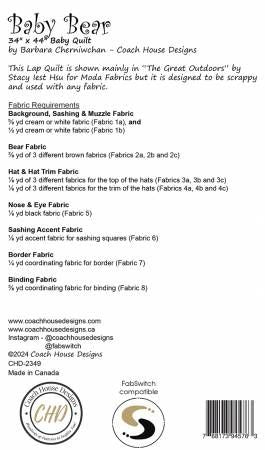 From Coach House Designs By Cherniwchan, Barbara In Quilts 34" x 44" scrappy baby quilt inspired by the Paddling Bears lap quilt. Printed Paper Patterns Finished Size: 34in x 44in Final Product: Quilt Technique Used: Standard Machine Sewing Skill Level: Confident Beginner