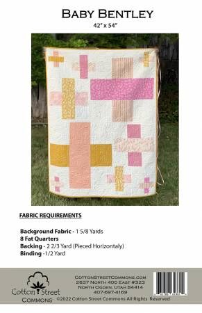 From Cotton Street Commons By Owen, Marcea In Quilts Baby Bentley is the perfect Baby Quilt. It uses 8 fat quarters and 1 5/8 Background Fabric which makes it easy to kit. It has large squares so it shows off fun prints. The size is also perfect 42" x 54" Printed Paper Pattern Finished Size: 42in x 54in Final Product: Quilt Technique Used: Standard Machine Sewing Skill Level: Beginner