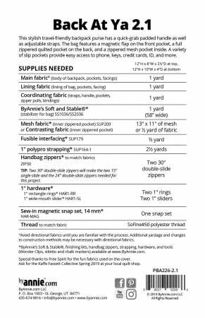 From ByAnnie In Bags, Purses, Totes & Electronic Covers This stylish travel-friendly backpack purse has a quick-grab padded handle as well as adjustable straps. The bag features a magnetic flap on the front pocket, a full zippered quilted pocket on the back, and a zippered mesh pocket inside. A variety of slip pockets provide easy access to phone, keys, credit cards, ID, and more. Finished size of backpack: 12""H x 8""W x 2½”D at top, 12”H x 10”W x 4”D at bottom NOTE TO STORES: Back At Ya 2.1 is an update of Back At Ya 2.0 which was released in 2017. Just like a new edition of a textbook, this new version of the pattern features improved design and layout, easier-to-follow steps and diagrams, and our newest and best techniques. We have also filmed an Add-On Video for the project to help your customers make the backpack. Since the Back At Ya 2.1 pattern includes a coupon to get the Add-On Video at no charge, we would recommend that they purchase the new and improved version of the pattern from you. CLASS INFO: Back At Ya 2.1 makes a great class for all levels of sewists, from beginners to more advanced makers. We'd suggest two half-day classes OR a full-day class for this project. If you split it into two classes, have the students prepare the components in the first class and assemble the backpack in the second class. We recommend that students come to class with their fabric quilted and everything cut out for their project. So, they should complete all of step I. Cut and Quilt on pages 2 and 3 before coming to class. Add-on Video notice: There is an Add-on Video™¿ available for this pattern. The Add-on Video™¿ is specially designed to support specific parts of the pattern and help the customer learn our best techniques. It doesn't replace the pattern -- it will enhance their sewing experience. To support local quilt shops, related paper patterns include a coupon for the value of the Add-on Video™¿. This is a $5.00 value. Customers can then use the coupon to get the video for free on our website.