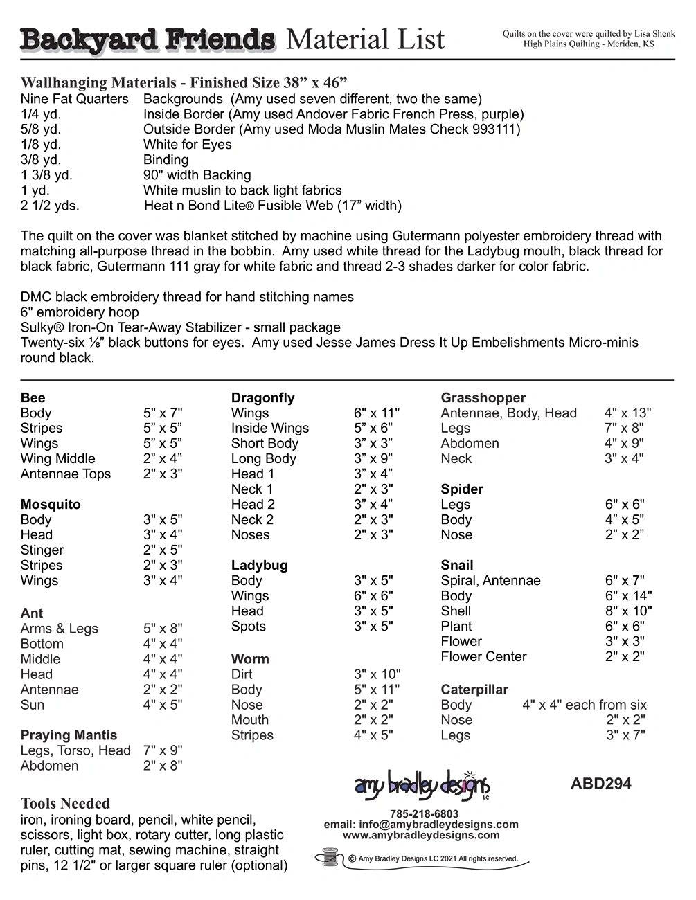 From Amy Bradley Designs By Bradley, Amy In Quilts Backyard Friends quilt pattern includes full size patterns, placement sheets, and instructions to make this 38" x 46" wall hanging quilt. The technique is fusible applique.