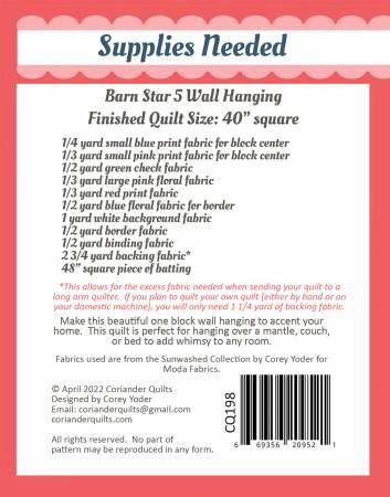 From Coriander Quilts By Yoder, Corey In Quilts Barn Star 5 is an intermediate level, pieced, wall-hanging pattern that will finish at 40" x 40". The pattern is full-color with clear illustrations and instructions. Barn Star 5 features the Sunwashed fabric collection by Corey Yoder of Coriander Quilts for Moda Fabrics. Printed Paper Pattern Finished Size: 40in x 40in Final Product: Quilt Technique Used: Standard Machine Sewing Skill Level: Intermediate