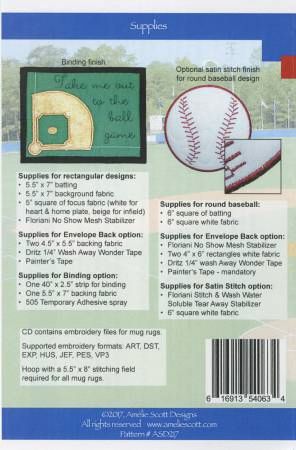 From Amelie Scott Designs By Conner, Christine In Coasters and Mug Rugs This pattern features five fast and fun in-the-hoop embroidery projects that celebrate America’s pass-time. Our Baseball Mug Rugs pattern includes four designs: a round baseball, a baseball field, there’s no place like home (plate), I Love Baseball and an I Love Softball design. Use your team’s colors in the fabric and threads. Baseball Mug Rug projects take about an hour to stitch out. The pattern includes digital embroidery files for all major machines, and step-by-step instructions with photographs. An embroidery hoop with a 5.5in x 8in stitching field is required. Supported embroidery formats: ART, DST, EXP, HUS, JEF, PEC, PES, VIP, VP3 Inside the pattern there is a download code to access the designs. All Amelie Scott Designs are now digital downloads.