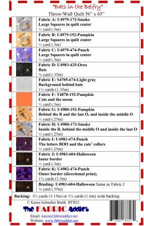 From Fabric Addict In Quilts Bats in the Belfry quilt pattern. Throw/Wall size. No curved piecing - curved look are pieces sewn on, and rolled back. Featured fabric is Boo by Hoffman. Printed Paper Pattern Finished Size: 56in x 65in Final Product: Quilt Technique Used: Standard Machine Sewing Skill Level: Intermediate