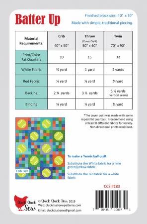 Batter Up features 3 sizes, Crib 40" x 50", Throw 50" x 60", and Twin 70" x 90". This pattern only uses simple conventional piecing techniques, no tricky seams, or foundation piecing. This pattern also includes the fabric options to make a Tennis ball quilt, with a full photo of the sewn tennis version on the inside cover.