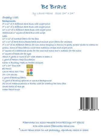 From Fiberworks Inc By Heine, Laura In Quilts Be Brave (Lion) Collage Pattern by Laura Heine is sure to provide a symbol of courage and bravery! This advanced collage pattern includes step by step color instructions and full sized pattern. Pattern also touches on using the Inktense pencils for shading. Finished size 24x24. Printed Paper Pattern Finished Size: 24in x 24in Final Product: Wall Hanging Paper Templates Included Technique Used: Standard Machine Sewing Skill Level: Advanced