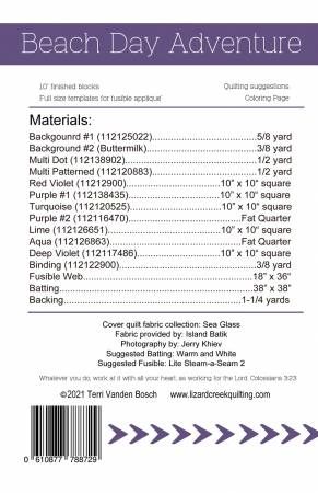 From Lizard Creek Quilting By Vanden Bosch, Terri WRAPUPSALE_2024 Collection In Quilts Beach Day Adventure will keep the sunshine bright all year long. Easy piecing to create the background for all the beach things fusible applique shapes. Size 36" x 36". Island Batik fabrics used for cover quilt. Pattern includes detailed cutting directions, step by step directions and diagrams, quilting suggestions along with a coloring page. Printed Paper Pattern Finished Size: 36in x 36in Final Product: Wall Hanging Paper Templates Included Technique Used: Applique / Standard Machine Sewing Skill Level: Beginner