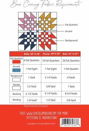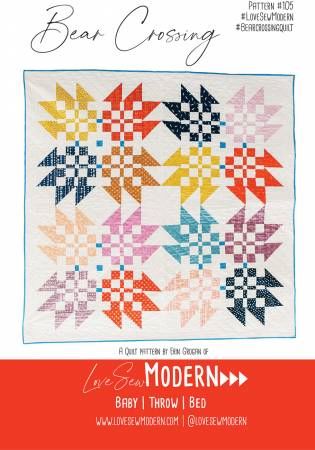 From Love Sew Modern By Grogan, Erin In Quilts The Bear Crossing quilt pattern is a modern take on the Bear Paw and a fat quarter friendly pattern. It comes in 3 sizes, Baby (38”X38”), Throw (69”X69”) and Bed (97”X97”). Bear Crossing is considered a confident beginner pattern using skills such as half square triangles and strip piecing. Included with the pattern is a coloring page and detailed visuals to clearly illustrate the quilt construction and skills. Printed Paper Pattern Finished Size: 38in x 38in Final Product: Quilt Technique Used: Standard Machine Sewing Skill Level: Confident Beginner