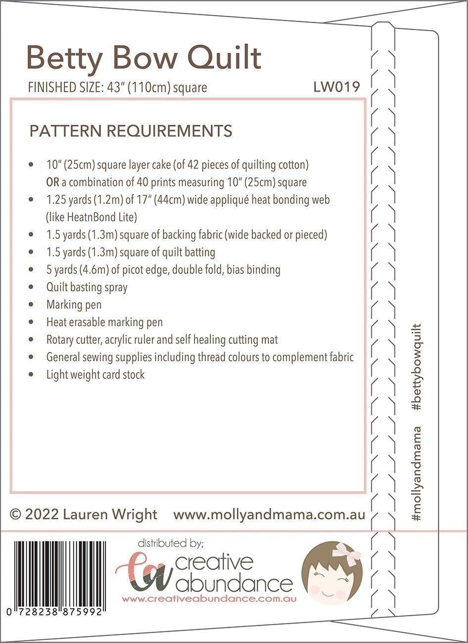 From Creative Abundance By Wright, Lauren In Quilts There's nothing sweeter than bows! The Betty Bow Quilt is a simple-to-sew, easy patchwork quilt, featuring raw-edge appliqué bows and curved quilt corners. Another skill building project, this quilt is the perfect introduction to simple quilting, raw-edge appliqué, and bias binding. It makes a lovely baby gift or play mat. Printed Paper Pattern Finished Size: 43in x 43in Final Product: Quilt Paper Templates Included Technique Used: Applique Skill Level: Beginner
