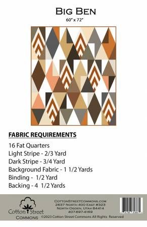 From Cotton Street Commons By Owen, Marcea In Quilt Big Ben is a beautiful quilt that lends itself to more masculine fabrics, although it would be amazing in florals also. The finished size is 60" x 72". The cover quilt uses a combination of wovens, flannels and texured fabrics. Great modern quilt. Printed Paper Pattern Finished Sizes: 60in x 72in Final Product: Quilt Technique Used: Standard Machine Sewing Skill Level: Confident Beginner