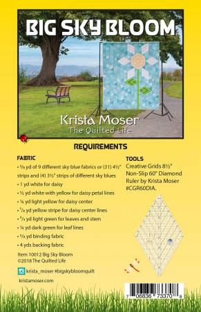 From Krista Moser, The Quilted Life By Moser, Krista In Quilts The Big Sky Bloom quilt is perfect for a little girls room, or as a cheerful answer to any room’s dreary decor. This pattern uses several features of the Creative Grids 60 degree Diamond ruler and has beautifully illustrated easy to follow instructions. Strip piece, then cut diamonds and triangles in different sizes to get the full effect. Finished size 62in x 73in