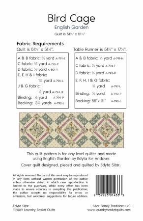 From Laundry Basket Quilts By Sitar, Edyta In Quilts Pieced quilt pattern featuring the "English Garden" fabric collection by Laundry Basket Quilts. Includes bonus pattern for table runner. Quilt Size is 51½" x 51½"Table Runner is 51½" x 17½" Printed Paper Pattern Finished Size: 51-1/2in x 51-1/2in Final Product: Quilt Technique Used: Standard Machine Sewing Skill Level: Any Level