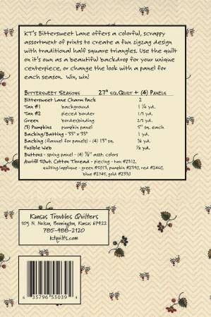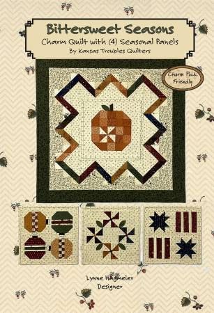 From Kansas Troubles Quilters By Hagmeier, Lynne In Quilts Bittersweet Seasons Charm Pattern (27" SQ.) KT's Bittersweet Lane charm packs offers a scrappy assortment for half square triangles in a fun zigzag design to frame (4) seasonal panels. Change the panels for the seasons, or use the quilt without a panel for a beautiful backdrop for your unique centerpiece. Win, Win!