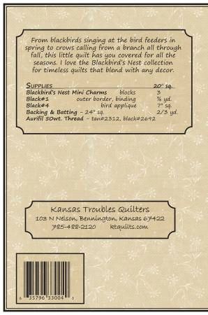 From Kansas Troubles Quilters By Hagmeier, Lynne In Quilts Blackbird's Nest MakeitMini#5 (20" sq.) From blackbirds singing at the bird feeders in spring to crows calling from a branch all through fall, this little quilt has you covered for all the seasons. I love the Blackbird's Nest collection for timeless quilts that blend with any decor. Printed Paper Pattern Finished Size: 20in x 20in Final Product: Quilt Technique Used: Standard Machine Sewing Skill Level: Confident Beginner