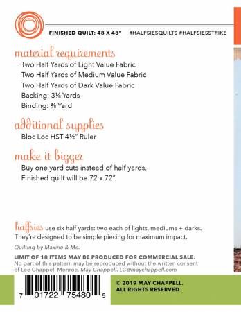From May Chappell By Monroe, Lee Chappell In Quilts Halfsies use six half yards: two each of lights, mediums + darks. They’re designed to be simple piecing for maximum impact. Finished size is: 48x48". Larger bonus size included uses six full yards. Printed Paper Pattern Finished Size: 48in x 48in Final Product: Quilt Technique Used: Standard Machine Sewing Skill Level: Confident Beginner