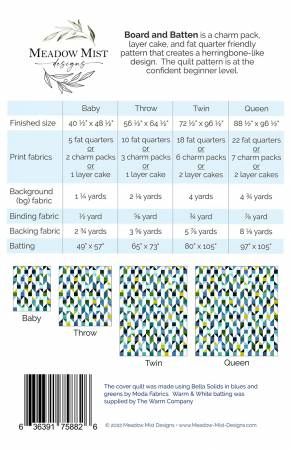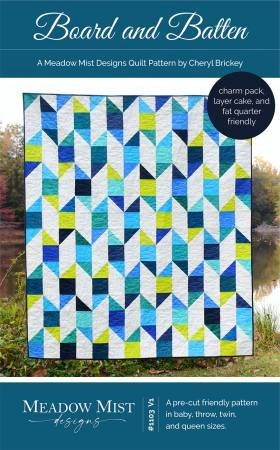 From Meadow Mist Designs By Brickey, Cheryl In Quilts Board and Batten is a super fun, beginner friendly pattern that is pre-cut friendly and contains instructions for four sizes (baby, throw, twin, and queen). This modern herringbone design is perfect for your charm pack, layer cake, fat quarters, or scraps. Baby: 40 ½" x 48 ½" Lap: 56 ½" x 64 ½" Twin: 72 ½" x 96 ½" Queen: 88 ½" x 96 ½" The throw-sized front cover quilt was made with a variety of Moda Bella solids in blues and greens on a Moda Bella solid background in Feather. Printed Paper Pattern Finished Size: Multiple Final Product: Quilt Technique Used: Standard Machine Sewing Skill Level: Confident Beginner