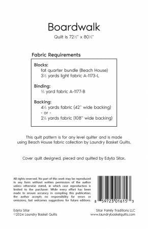 From Laundry Basket Quilts By Sitar, Edyta In Quilts Boardwalk is for any level quilter! Quilt features the Beach House fabric collection designed by Edyta Sitar for Andover. Printed Paper Pattern Finished Size: 72-1/2in x 80-1/2in Final Product: Quilt Technique Used: Standard Machine Sewing Skill Level: Any Level