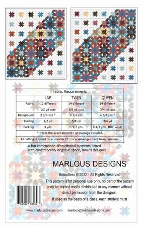 From Marlous Designs By Carter, Marlous In Quilts A traditional block in a modern setting. Pattern directions for 3 sizes: lap - 64'' x 76'' , twin -76'' x 88'' and queen -88'' x 100'' Printed Paper Pattern Finished Size: Multiple Final Product: Quilt Technique Used: Standard Machine Sewing Skill Level: Confident Beginner