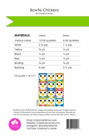 Bowtie Chickens is a fun quilt that is Fat Quarter friendly. It does use templates that are included for some of the parts. This quilt offers 2 sizes. Printed Paper Pattern Finished Size: Multiple Final Product: Quilt Paper Templates Included Technique Used: Standard Machine Sewing Skill Level: Confident Beginner