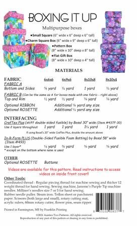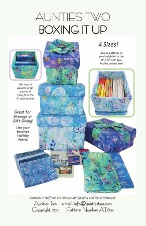 Great for gift giving or storage!! Very sturdy, stackable boxes Four Sizes: 6” wide x 6” tall x 9” deep -great for charm squares or fat quarters 6” wide x 6” tall x 6” deep with a rosette on the top 8” wide x 4” tall x 10” deep – with a bow! 8” wide x 8” tall x 10” deep – will fit patterns galore!