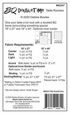 From Maple Island Quilts By Bowles, Debbie In Quilts Give your table a fun look with a doubled BQ frame surrounding something special. 18in x 27in and 18in x 44in. Optional inner border. The smaller project is FQ friendly.