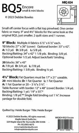 From Maple Island Quilts By Bowles, Debbie In Quilts Small off center focus with a flat top pinwheel. One center fabric or many. 9" and 4 1/2" blocks for the same look as the original BQ5, just smaller. 2 quilt sizes in the 9" block size. 27" x 36" and 36" x 45". 1 table runner in the 4 1/2" block size, 12" x 48". Printed Paper Pattern Finished Size: Multiple Final Product: Quilt and Table Runner Technique Used: Standard Machine Sewing Skill Level: COnfident Beginner