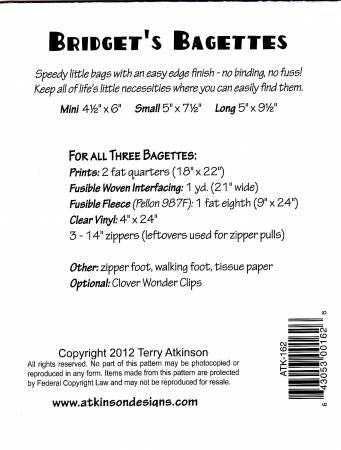 From Atkinson Designs By Atkinson, Terry In Bags, Purses, Totes & Electronic Covers Speedy little bags with an easy edge finish. No binding, no fuss! Keep all of life's little necessities where you can easily find them. Mini 4-1/2in x 6in, Small 5in x 7-1/2in, 5in x 9-1/2in