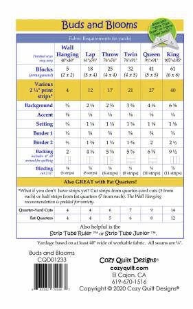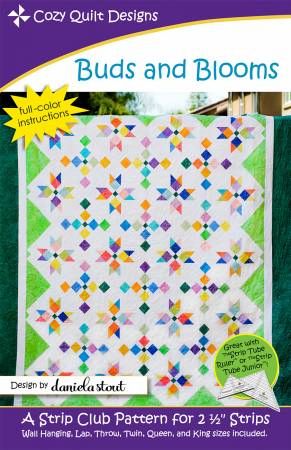 From Cozy Quilt Designs By Craig, Sharyn In Quilts Flower motifs and delicate petal chains blossom across Buds and Blooms, a pattern designed by Daniela Stout for 2½" strips - but it works great with fat quarters too! This pattern includes full color instructions for the following sizes: wall hanging, lap, throw, twin, queen, and king. Printed Paper Pattern Finished Size: Multiple Final Product: Quilt Technique Used: Standard Machine Sewing Skill Level: Beginner